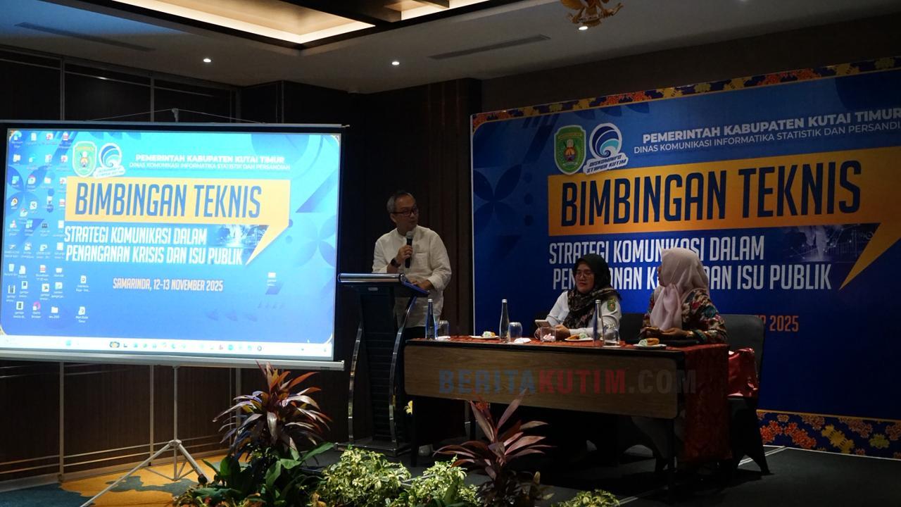 Samarinda – Upaya meningkatkan kualitas pengelolaan informasi publik di lingkungan Pemerintah Kabupaten Kutai Timur kembali dilakukan melalui kegiatan Bimbingan Teknis Strategi Komunikasi Publik dalam Penanganan Krisis dan Isu Publik yang diselenggarakan oleh Dinas Kominfo Staper Kutim di Hotel Fugo Samarinda, Rabu (12/11/2025). Kegiatan ini diikuti oleh para Pranata Humas dari berbagai perangkat daerah.