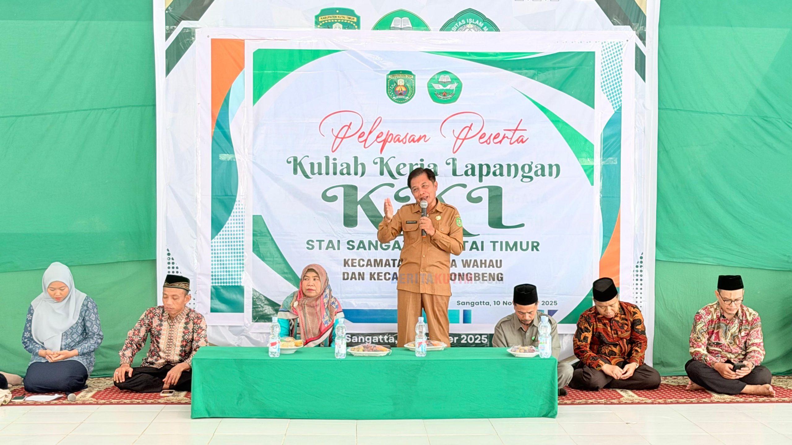 Sangatta – Sebanyak 145 mahasiswa Sekolah Tinggi Agama Islam Sangatta (STAIS) Kutai Timur resmi diberangkatkan untuk mengikuti Kuliah Kerja Lapangan (KKL) di Kecamatan Muara Wahau dan Kombeng, Senin (10/11/2025). Prosesi pelepasan dilakukan oleh Asisten Administrasi Umum Sekretariat Kabupaten Kutim, Sudirman Latif, di halaman Masjid STAIS dan disaksikan jajaran pimpinan kampus serta para dosen pembimbing.